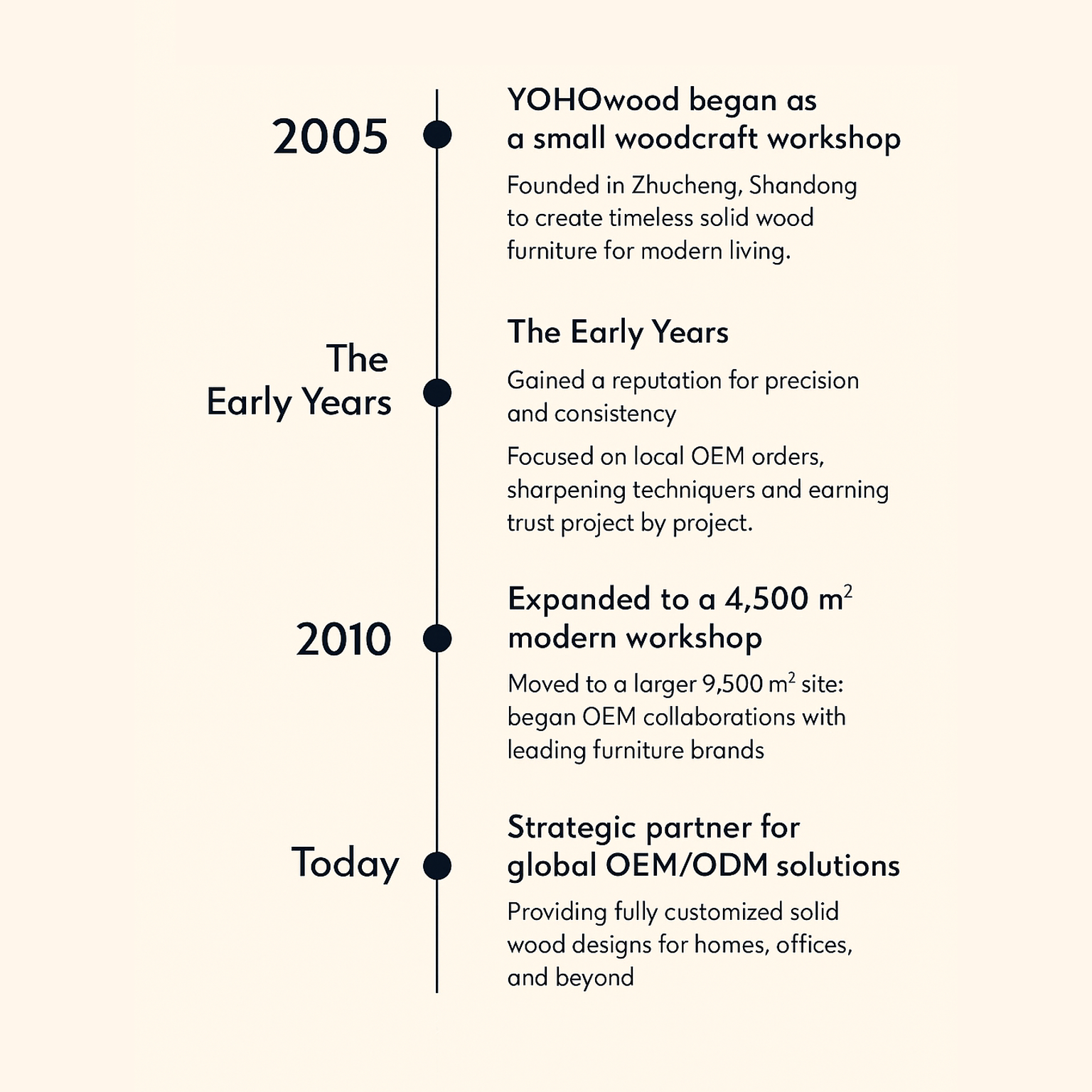 YOHOwood began in 2005 as a small woodcraft workshop in Zhucheng, Shandong — founded with a craftsman’s heart and a dream to bring timeless solid wood furniture into modern living.
